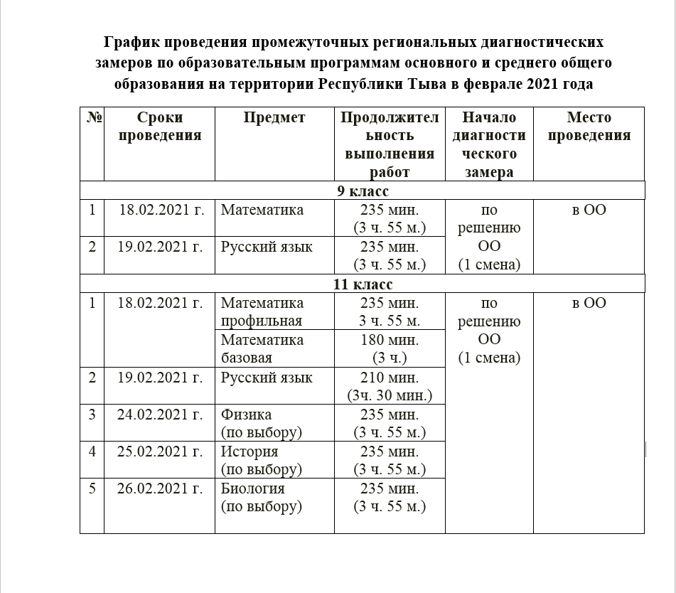 На основании приказа министерства образования и науки Республики Тыва от 15.02.2021г. №172-д «О проведении промежуточных региональных замеров в Республике Тыва в феврале 2021 года», в целях повышения качества образовательных результатов и обеспечения подготовки к успешному прохождению государственной итоговой аттестации по образовательным программам основного общего и среднего общего образования в 2020-2021 уч. году, будут проводить с 18 по 26 февраля 2021г. для 9 и 11 классов в соответствии с графиком: